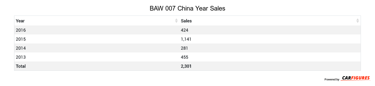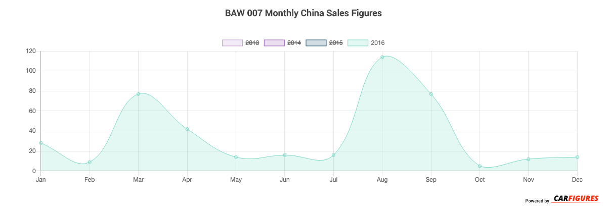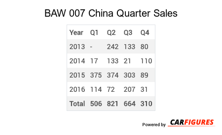 BAW 007 China Sale figures by year, quarter, and month are presented below. Including the most up to date sales data for the BAW 007.